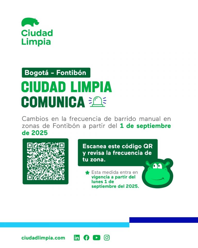 Ciudad Limpia, operación Bogotá, informa a los usuarios del servicio de aseo de la localidad de Fontibón que, a partir del 1 de septiembre del 2025, habrá cambios en la frecuencia de barrido manual en algunas zonas de esta localidad.