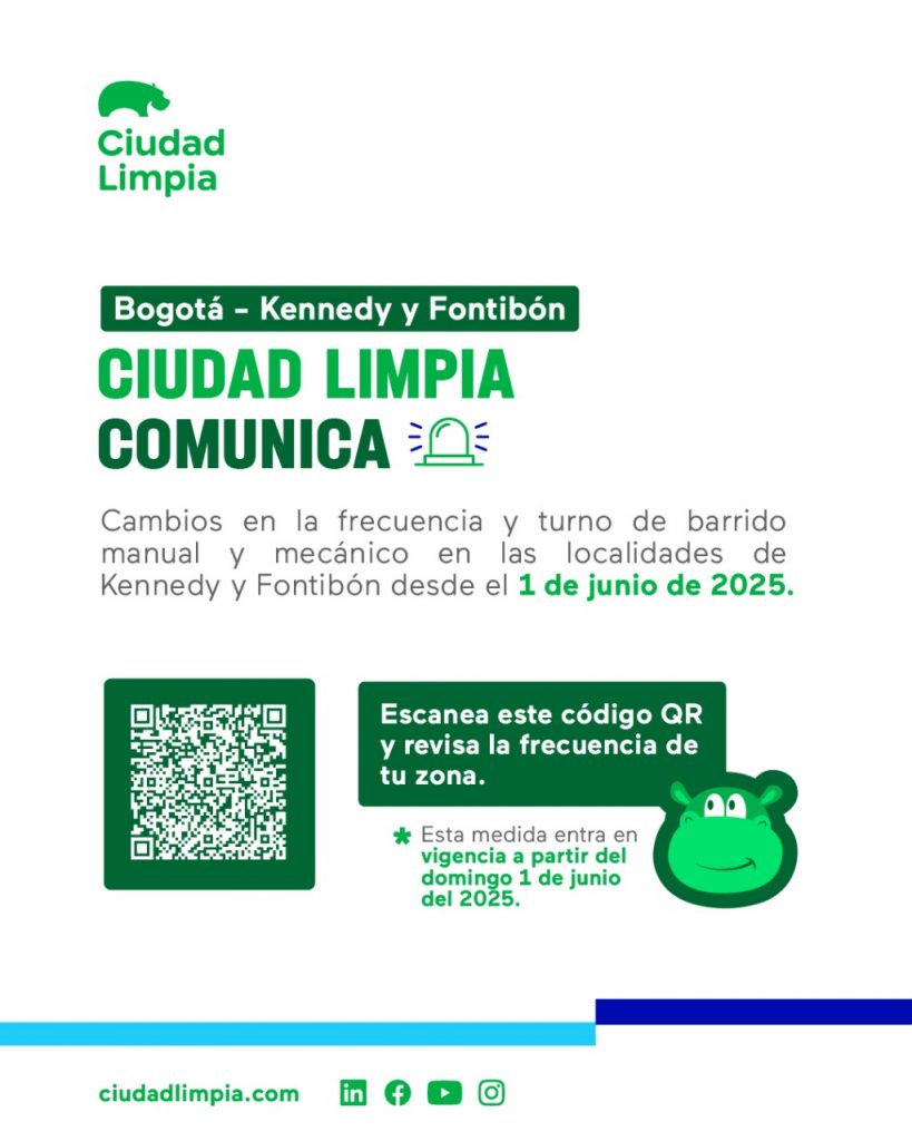Ciudad Limpia informa a sus usuarios de las localidades de Kennedy y Fontibón que desde el domingo, 01 de junio, habrá cambios en la frecuencia y turno del servicio de barrido manual y mecánico.