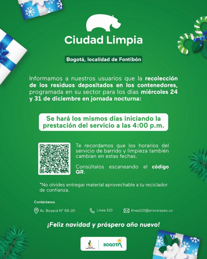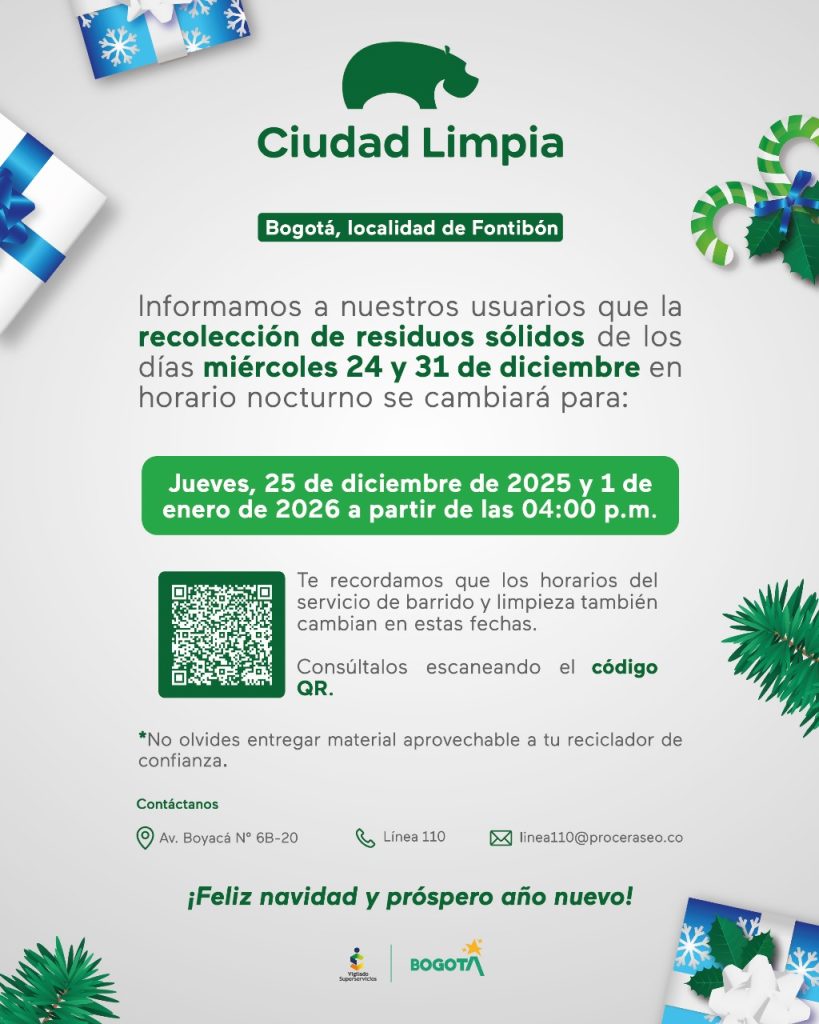 Ciudad Limpia informa a todos los usuarios del sector de Fontibón que, con motivo de las celebraciones navideñas y de fin de año, se implementarán ajustes en los horarios y frecuencias de recolección de residuos sólidos, así como en la recolección de residuos en contenedores, durante las noches de los días miércoles 24 y 31 de diciembre de 2025.