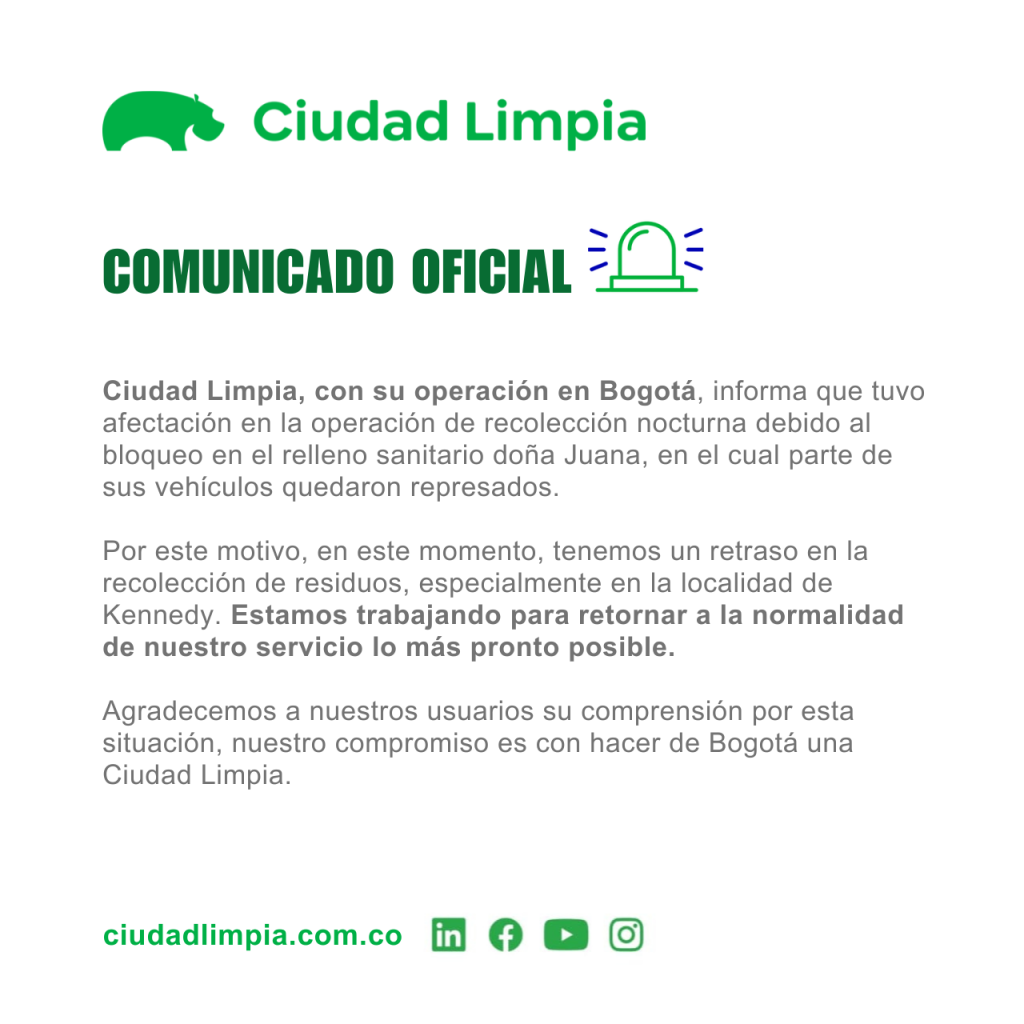Ciudad Limpia informa que tuvo afectación en la operación de recolección nocturna debido al bloqueo
