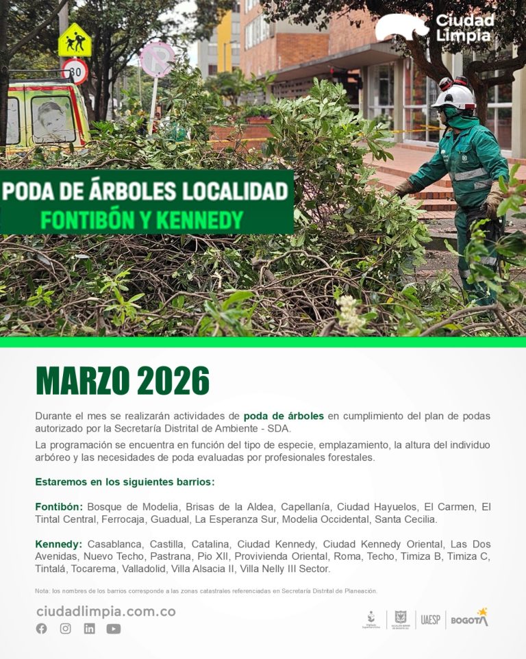 Durante el mes de marzo se desarrollará una nueva jornada de poda de árboles en diferentes barrios de las localidades de Fontibón y Kennedy, con el objetivo de garantizar el adecuado mantenimiento del arbolado urbano y contribuir a la seguridad y bienestar de la comunidad.